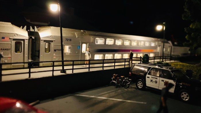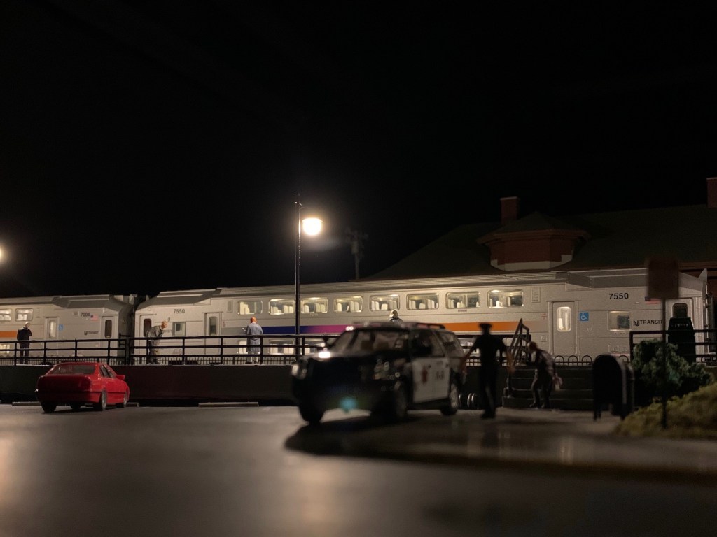 Montclair station lights up with the arrival of NJ Transit 4515 from Hoboken with busy commuters after a long day at the office.